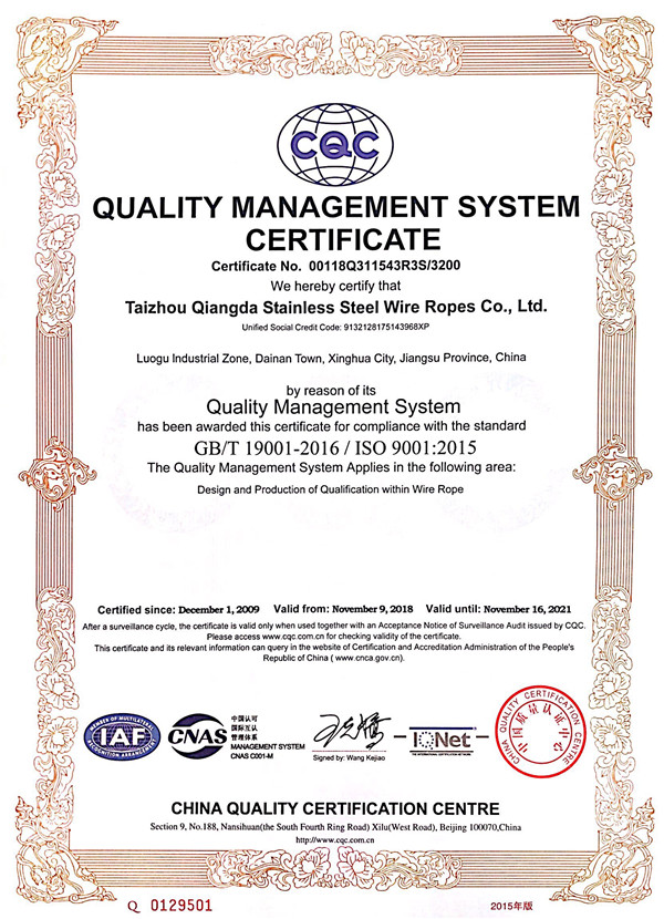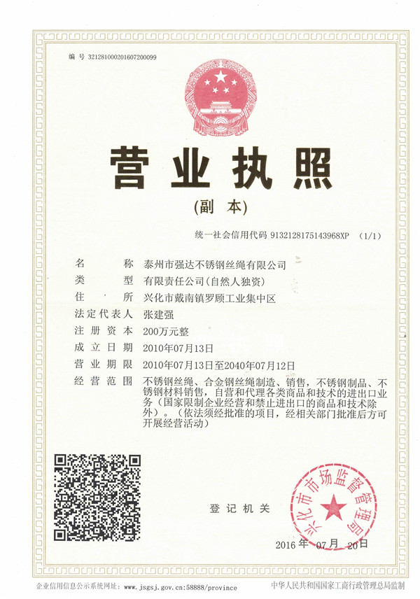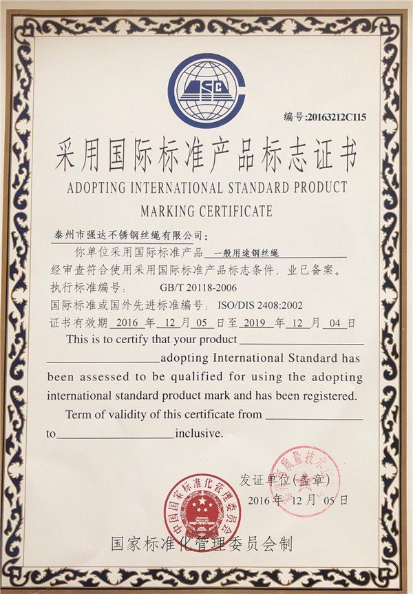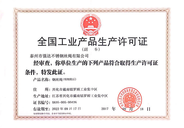 泰州市強(qiáng)達(dá)不銹鋼絲繩有限公司位于江蘇興化市戴南經(jīng)濟(jì)開發(fā)區(qū),公司致力于不銹鋼絲繩產(chǎn)品生產(chǎn),立志成為“國內(nèi)技術(shù)標(biāo)桿型吊索具生產(chǎn)企業(yè)”。以此戰(zhàn)略思想指導(dǎo),公司堅決貫徹“質(zhì)量贏市場,管理增效益,誠信贏天下”的質(zhì)量方針。以完善的服務(wù)在國內(nèi)不銹鋼絲繩市場樹立良好的品牌形象。公司榮獲“江蘇省質(zhì)量信得過企業(yè)。     靈活的管理機(jī)制,經(jīng)驗豐富的
